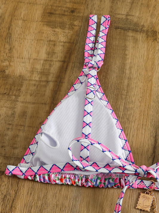 Women's flower print suspenders sexy lace-up two-piece bikini
