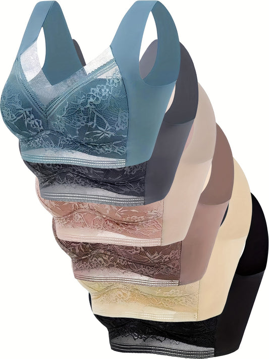 6pcs Comfy and Breathable Floral Lace Sports Bra for Women - Full Coverage Wirefree Yoga Bra - Women's Activewear