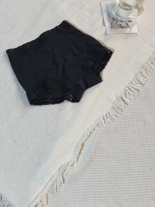 1 Pc Solid Floral Lace Contrast High Waist Front Buckle Shaping Shorts, Tummy Control Butt Lifting Shorts, Women's Underwear & Shapewear