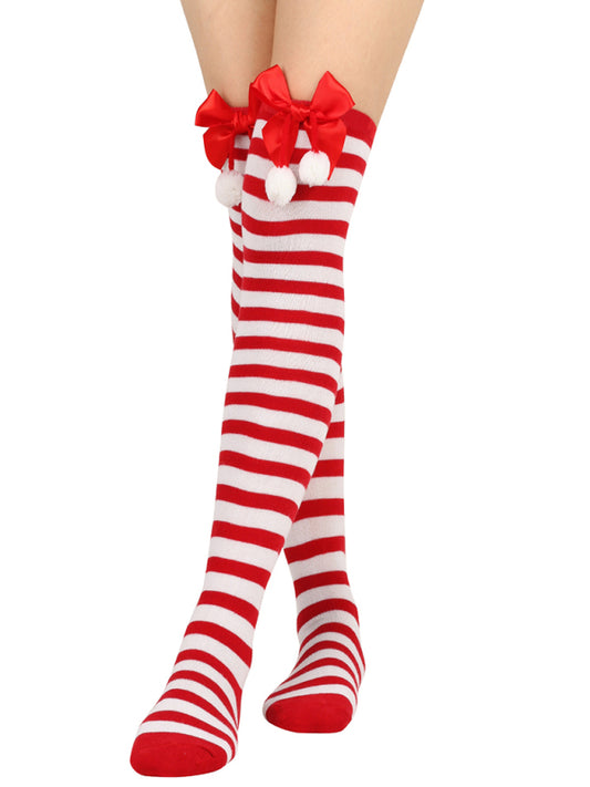 Nuevos calcetines navideños con lazo, calcetines con bolas, calcetines por encima de la rodilla, medias navideñas largas a rayas para mujer