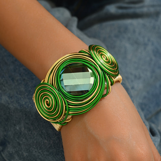 Exquisita pulsera abierta hecha a mano de estilo bohemio, envuelta en alambre de aleación de aluminio redondo, decoración de cristal artificial