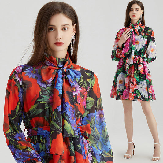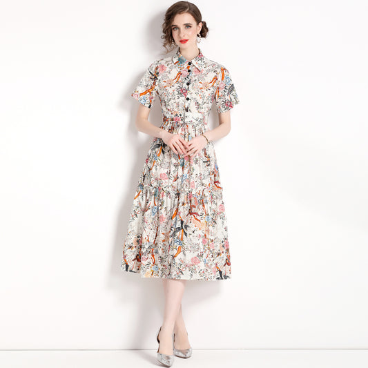 Vestido de moda para dama con estampado de pájaros cantores y flores
