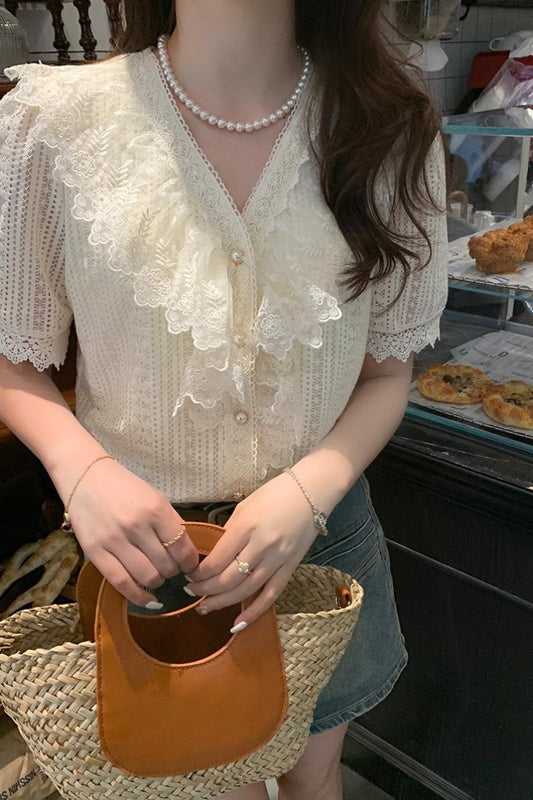Camisa de encaje de manga corta con cuello en V y volantes
