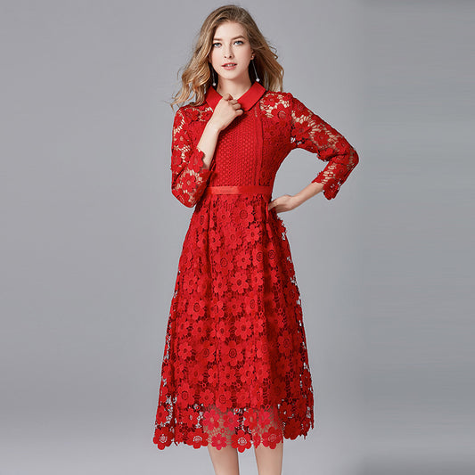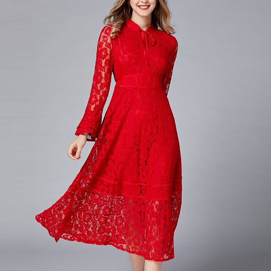 Vestido de mujer de talla grande con encaje soluble en agua y manga larga en forma de A con falda roja