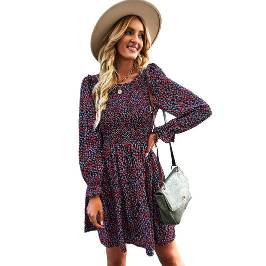 Vestido floral de cuello redondo de invierno de manga larga con falda en forma de A a juego