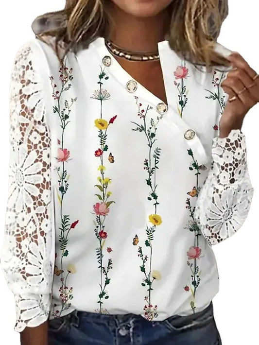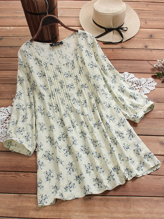 Camisa de mujer de gran tamaño con estampado floral y cuello redondo plisado