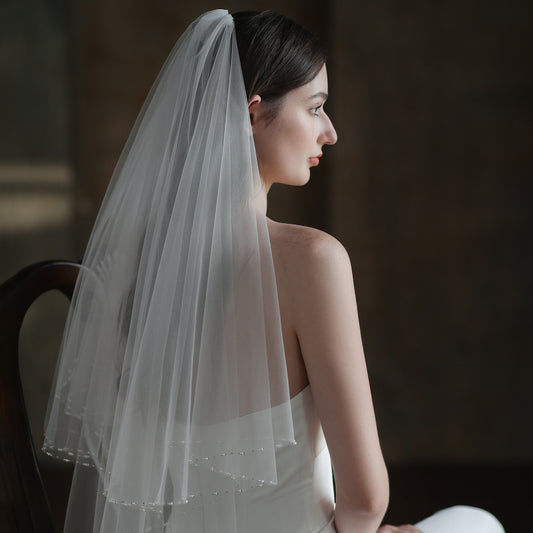 Exquisito velo de novia con cuentas hecho a mano