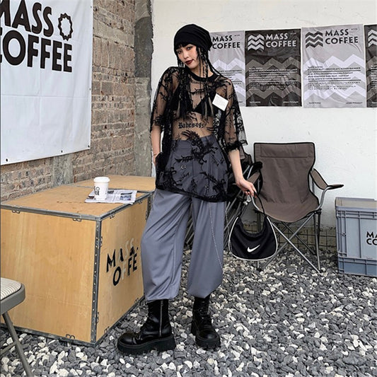 Camiseta de rejilla transparente con cintura alta y aberturas para mujer