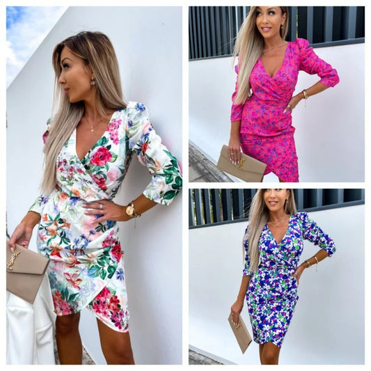 Vestido de falda asimétrica de manga 34 con escote en V profundo y mangas abullonadas nuevo a la moda