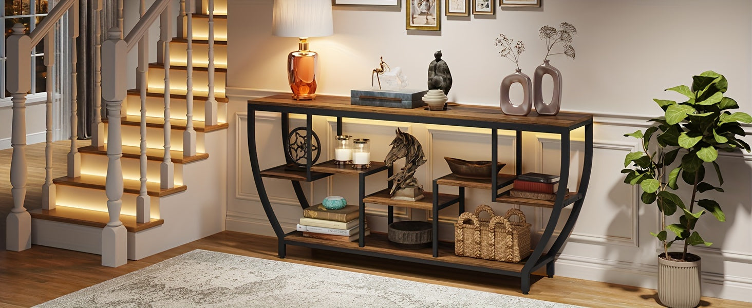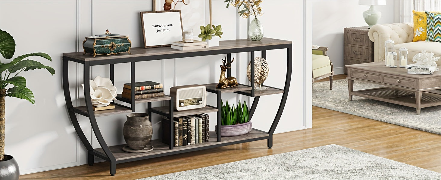 LARGE STORAGE SPACE: Measuring 70.86’’W X 11.81’’D X 35.43’’H, The Sofa Table With 7 Shelves Offers Ample Platform For Everything To Display On, Like Your Go-to Books, Framed Photos, Vases, Artistic Accents, Or Other Decors. The Unique Staggered Shelves Bring Your Display Space A Pop Of Character.
