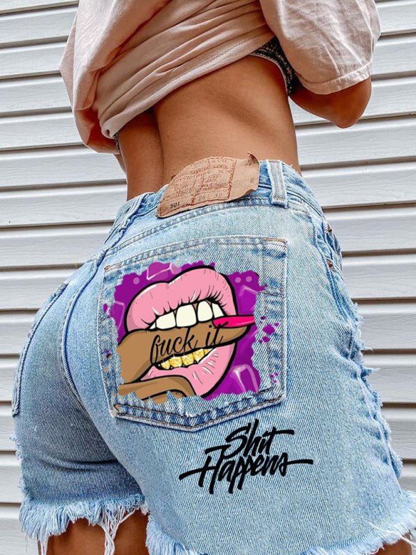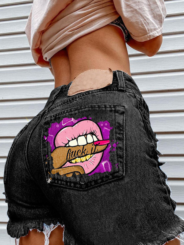 Lips Biting Finger Print Fashion Ripped Denim Shorts