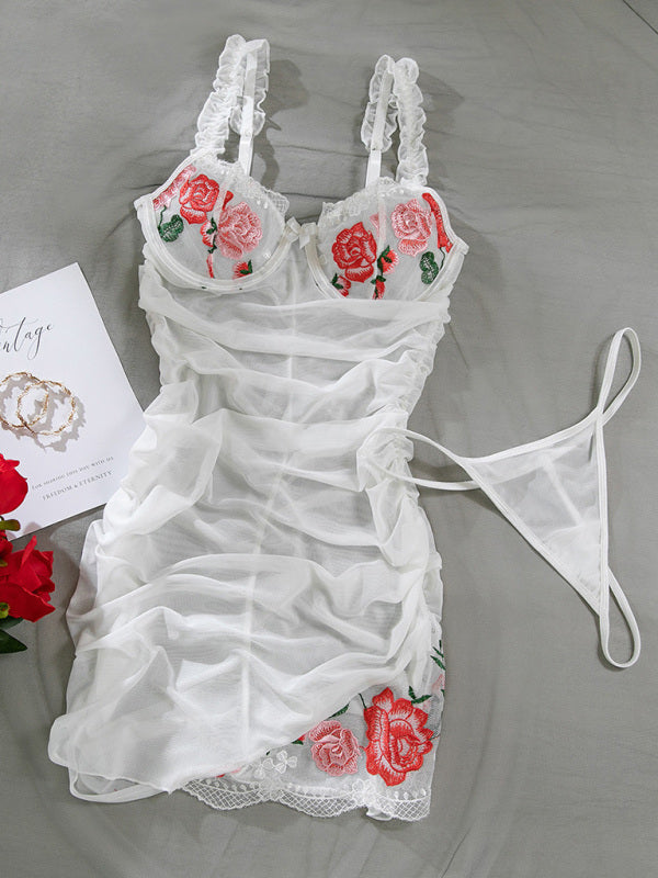 Sexy suspender dress embroidered flowers mesh see-through pleated two-piece set